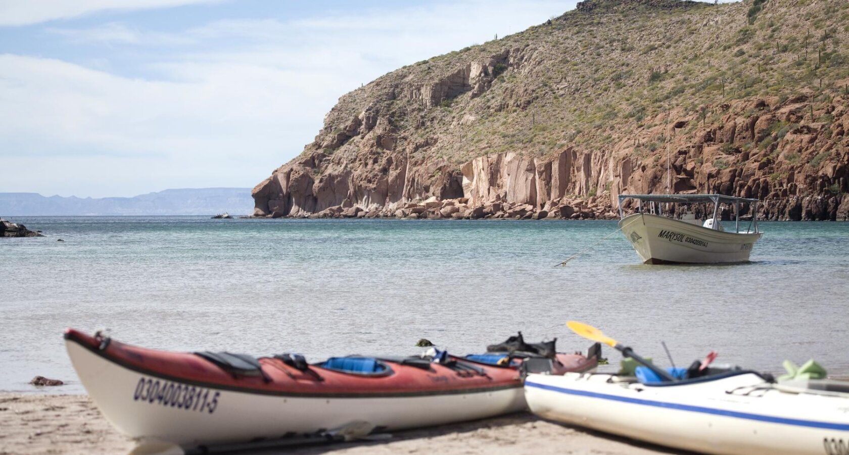 Kayaks rest on a beach on an island in the Sea of Cortez